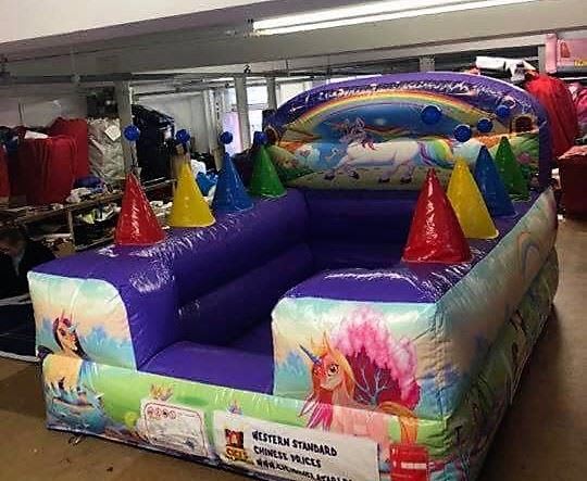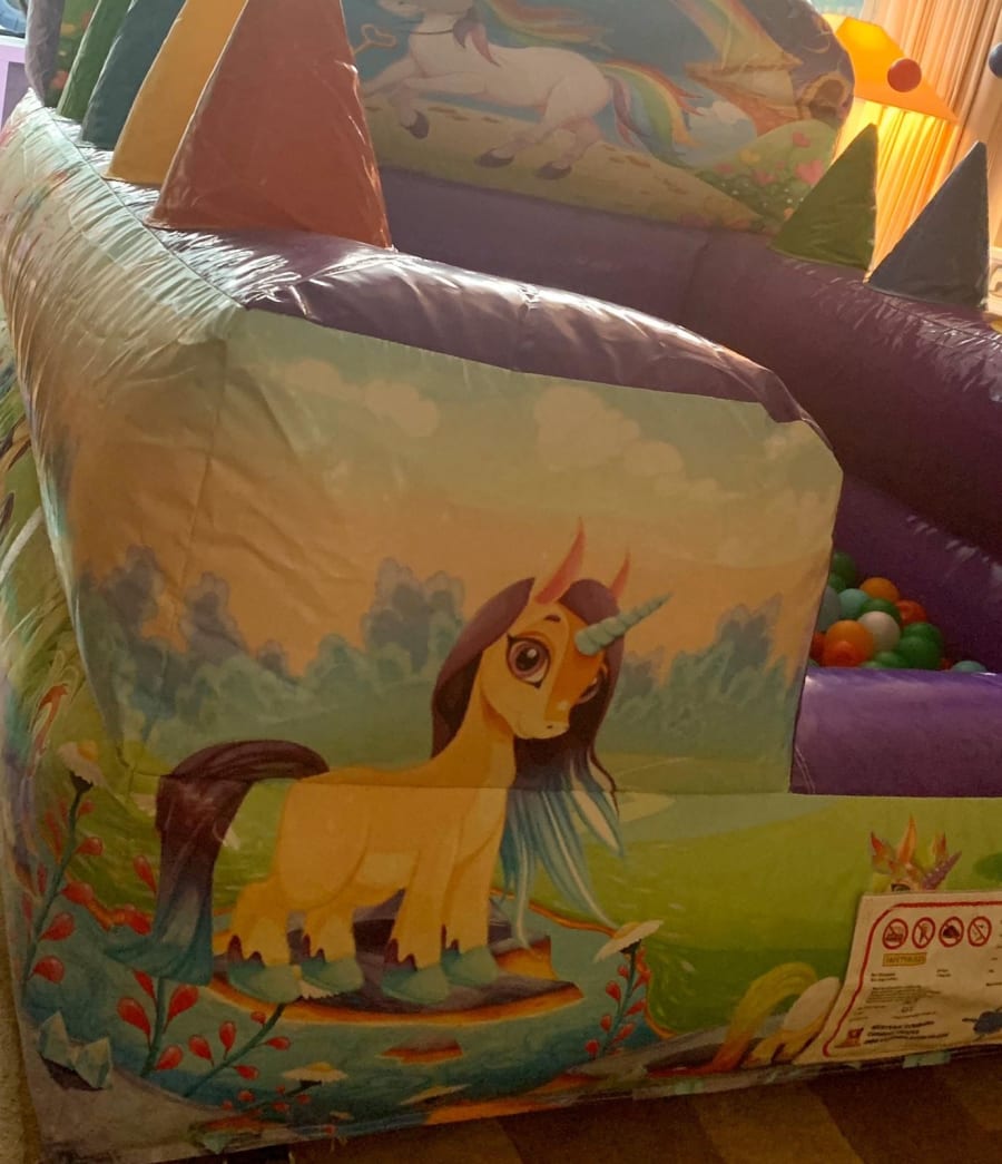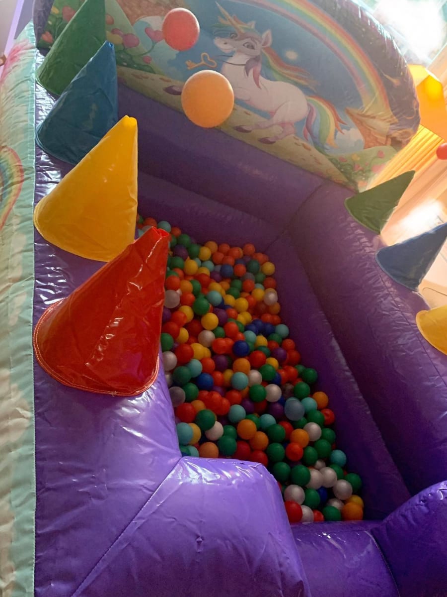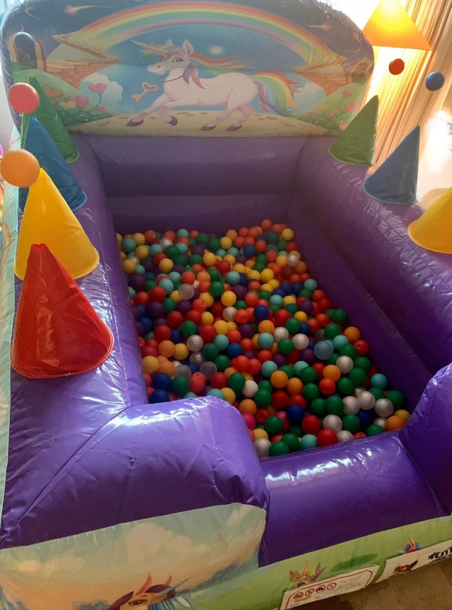 Large Unicorn 8ft x 6ft ball pond filled with commercial play balls and 4 air jets to float balls on each side wall.