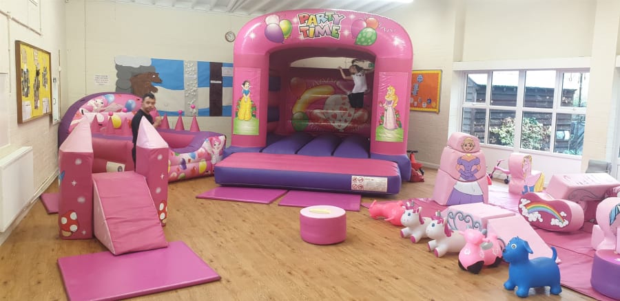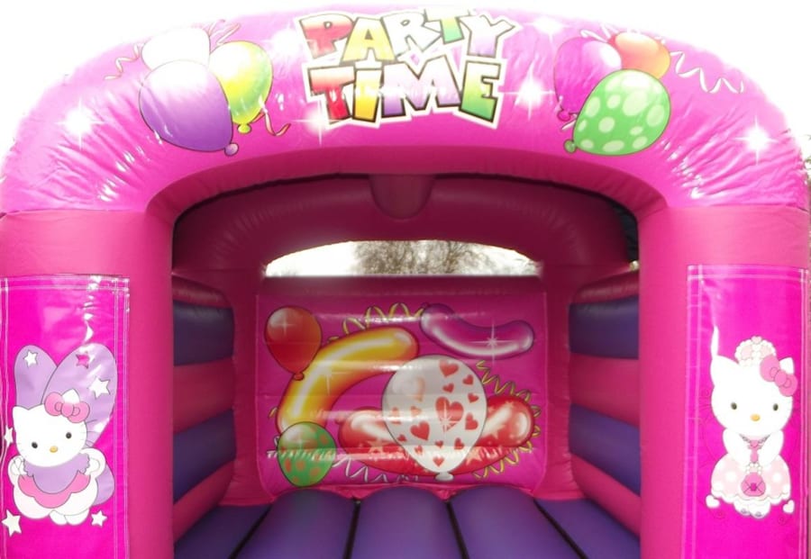 A Party Time themed castle with removable artwork on the columns in the following themes:
