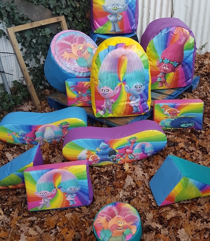 12 pieces of Trolls softplay on a large mat., including
