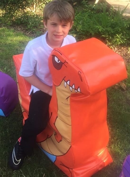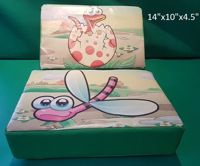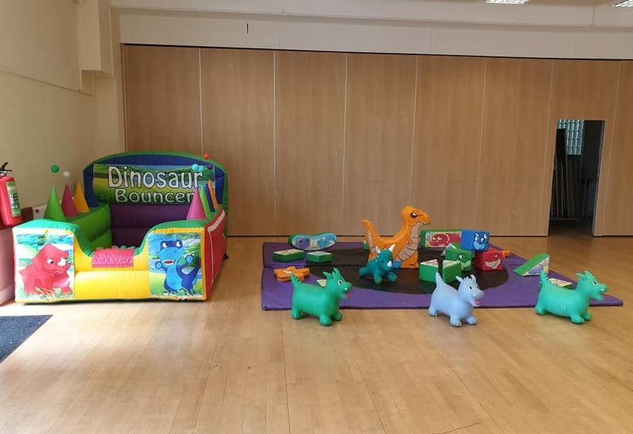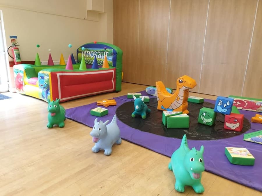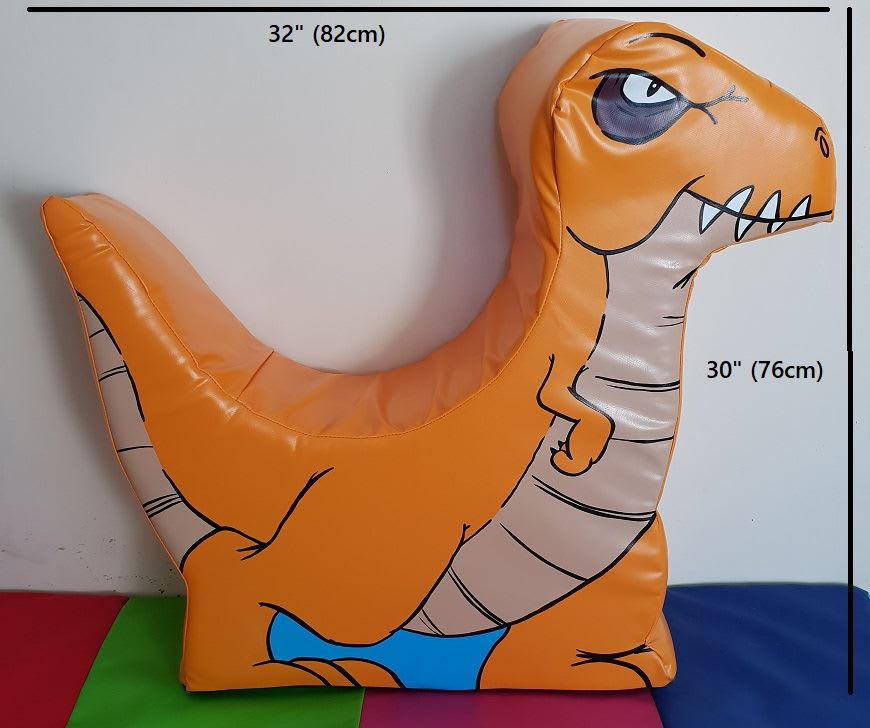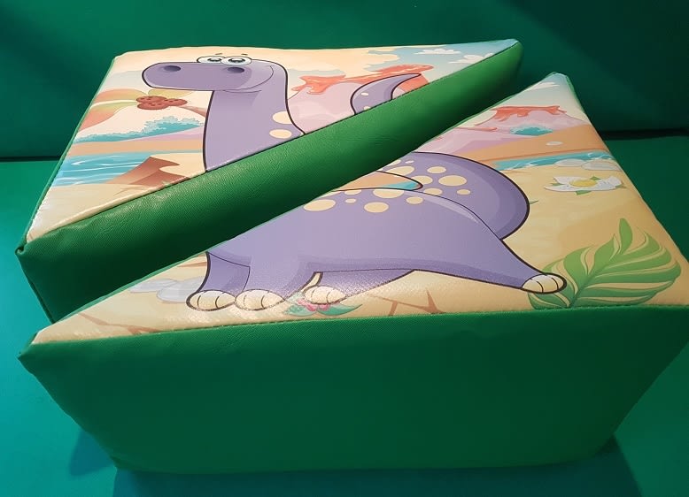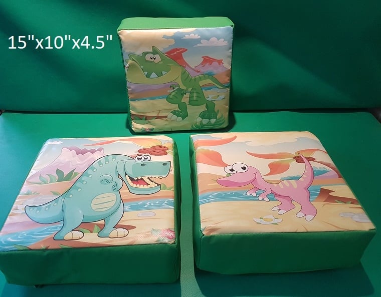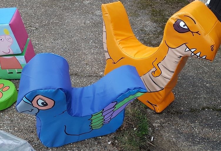 8 cubes and 4 large pieces of dinosaur softplay including ride-on T Rex and 2 dinosuar Happy Hopperz on large mat