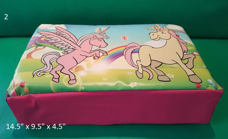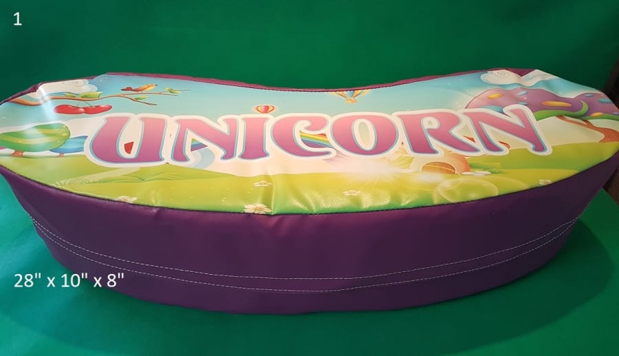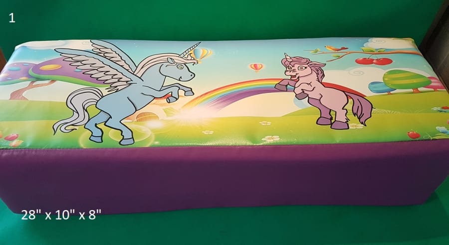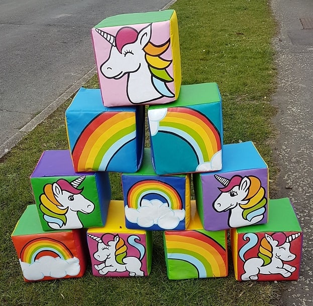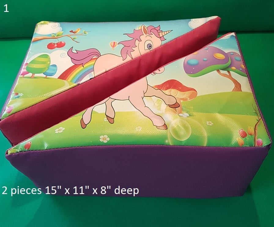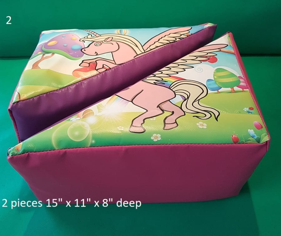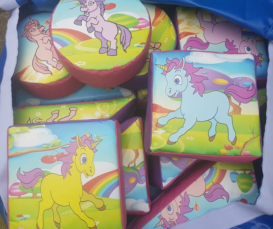 16 pieces of unicorn soft play on large mat. includes 2 large rockers 2 large beams 4 triangles, 4 squares 3 rectangles and 3 rounds