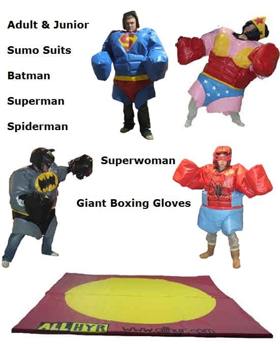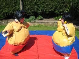 A set of Junior Sumo Suits (2 Suits). Includes helmet and 2" thick soft mat.