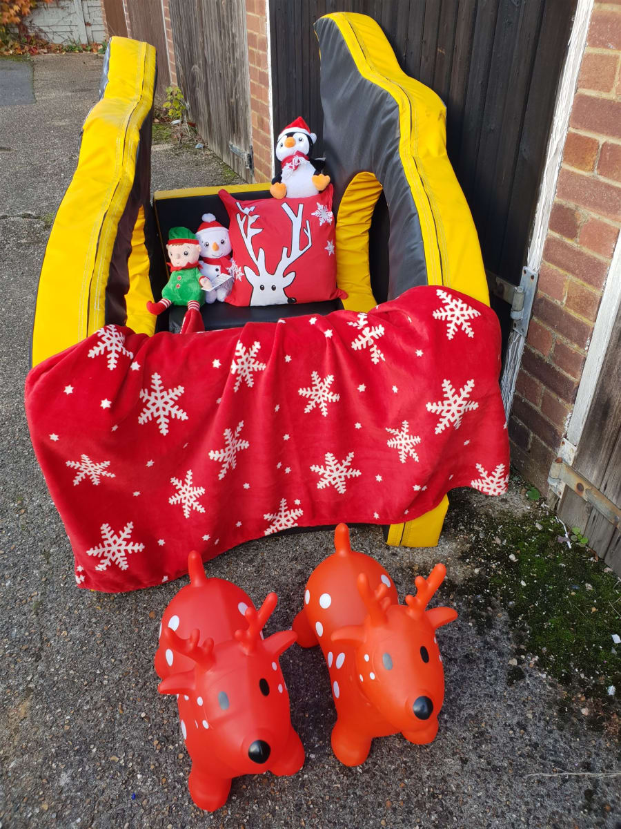 5ft x 4ft soft play bat mobile dressed as Christmas Sleigh with 2 happy hopper reindeer and toys